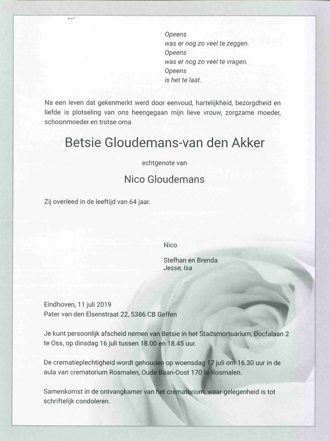 Wij wensen haar man Nico, zoon Stefhan, schoondochter Brenda, kleinzoon Jesse, kleindochter Isa, familie Gloudemans en familie van den Akker veel sterkte toe met dit verlies.