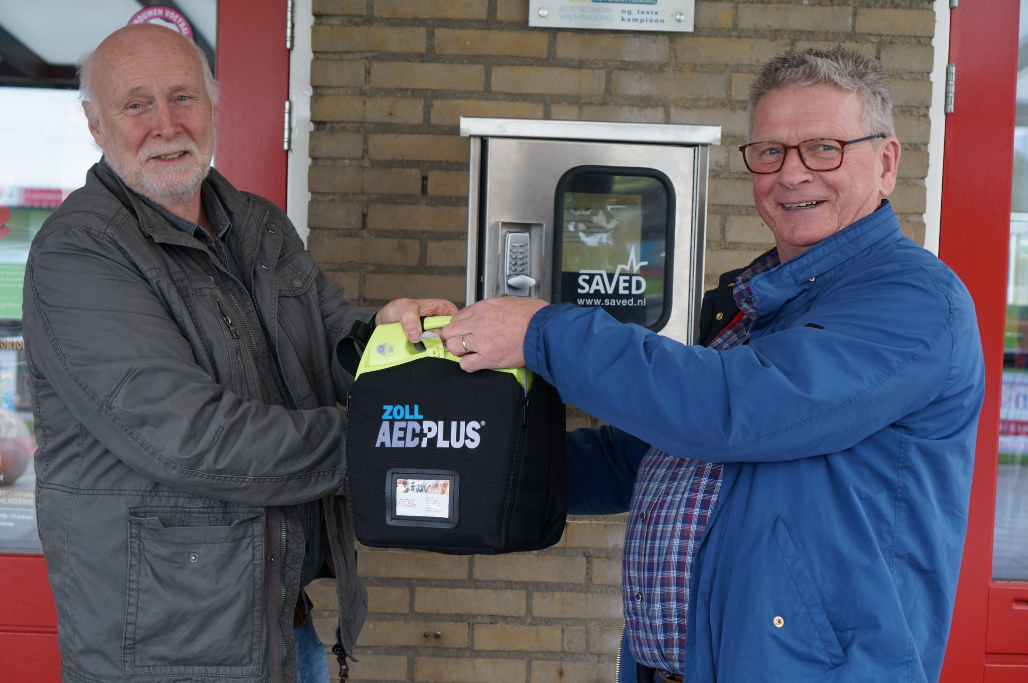 Fotobijschrift: Mari Strik (Nooit Gedacht) en Jos de Veer (stichting AED-beheer Geffen)